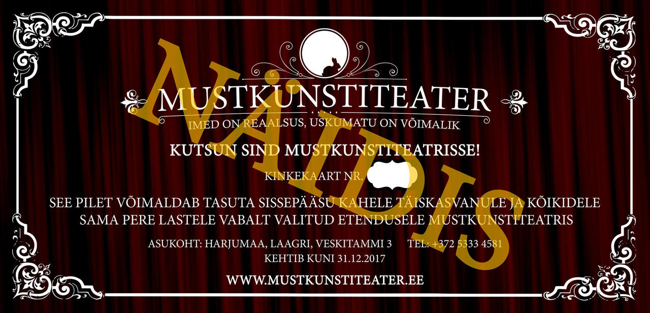 Võimaldab sissepääsu kahele täiskasvanule ja kõikidele sama pere lastele (kuni 18 a), vabalt valitud tavaetendusele Mustkunstiteatris 2025 aastal.