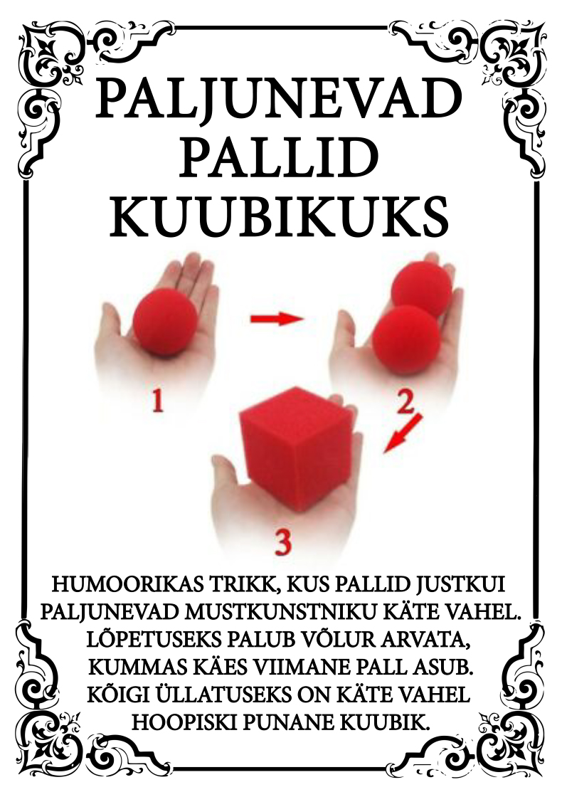 Mustkunstnik leiab vabatahtliku kõrva tagant punase palli ja küsib, kas ta võib selle endale jätta. Ta paneb pallikese kõigi silme ees oma taskusse. Sama kiiresti aga leiab ta palli tagasi oma käte vahelt. Ta kordab tegevust, kuid pallid tunduvad paljunevat ja palle ilmub aina rohkem ja rohkem. Kui viimaks tundub, et maagi taskusse rohkem palle ei mahu, teeb ta ettepaneku: "Arva ära kumbasse kätte ma selle palli peidan!" Ta surub pallikese oma ühte kätte ja segab käsi et, publikut segadusse ajada. "Kummas käes on punane pall?" Võlur on aga kaval ja ükskõik millist kätt valida oleks vastus vale. Üks käsi on tühi ja teises ei ole mitte pall vaid hoopiski punane kuubik!